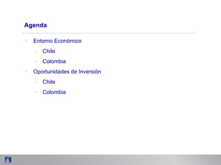El documento presenta información sobre las economías de Chile y Colombia. Resalta que ambas han logrado consolidar modelos económicos de libre mercado que ahora están dando frutos a través de un crecimiento estable del PIB y un aumento sostenido del ingreso per cápita. Luego analiza aspectos clave de cada economía como el entorno macroeconómico, sectores productivos, comercio exterior, perspectivas de crecimiento e inversiones. Finalmente, identifica oportunidades de inversión en sectores como forestal, eléctrico,