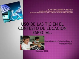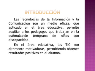 El documento describe el uso de las tecnologías de la información y la comunicación (TIC) en la educación especial, facilitando la estimulación temprana de niños con discapacidad. Las TIC son altamente motivadoras y permiten obtener resultados positivos en los alumnos. El marco legal venezolano garantiza el acceso a las TIC con fines educativos y de desarrollo.