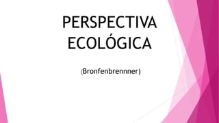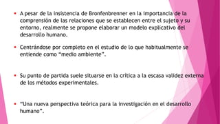 El documento resume la teoría ecológica del desarrollo humano de Bronfenbrenner. Propone que el desarrollo se ve influenciado por múltiples sistemas ambientales que interactúan, incluyendo el microsistema (entorno familiar), mesosistema (interacción entre microsistemas), exosistema (entornos que influyen indirectamente) y macrosistema (valores culturales). Bronfenbrenner argumenta que para comprender el desarrollo humano se debe estudiar al individuo dentro del contexto de estos diferentes sistemas ambient