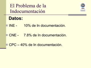 El documento describe el problema de la indocumentación en Bolivia. Datos del INE, CNE y CPC muestran que entre el 7.8-40% de la población carece de documentos de identidad. El CPC ha documentado a 4,132 personas mediante trámites administrativos y 341 mediante trámites judiciales. Se han obtenido 5,939 pruebas para la obtención de certificados de nacimiento u otros documentos legales. La indocumentación agrava la pobreza y exclusión social.