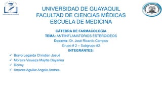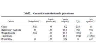 1) Este documento describe los efectos fisiológicos y farmacológicos de los glucocorticoides y corticoides sintéticos. 2) Explica sus mecanismos de acción a nivel celular e incluye información sobre sus receptores, y describe ampliamente sus acciones metabólicas, antiinflamatorias, inmunológicas, cardiovasculares, musculoesqueléticas y en el sistema nervioso central. 3) El documento fue preparado por estudiantes de medicina de la Universidad de Guayaquil para una clase de