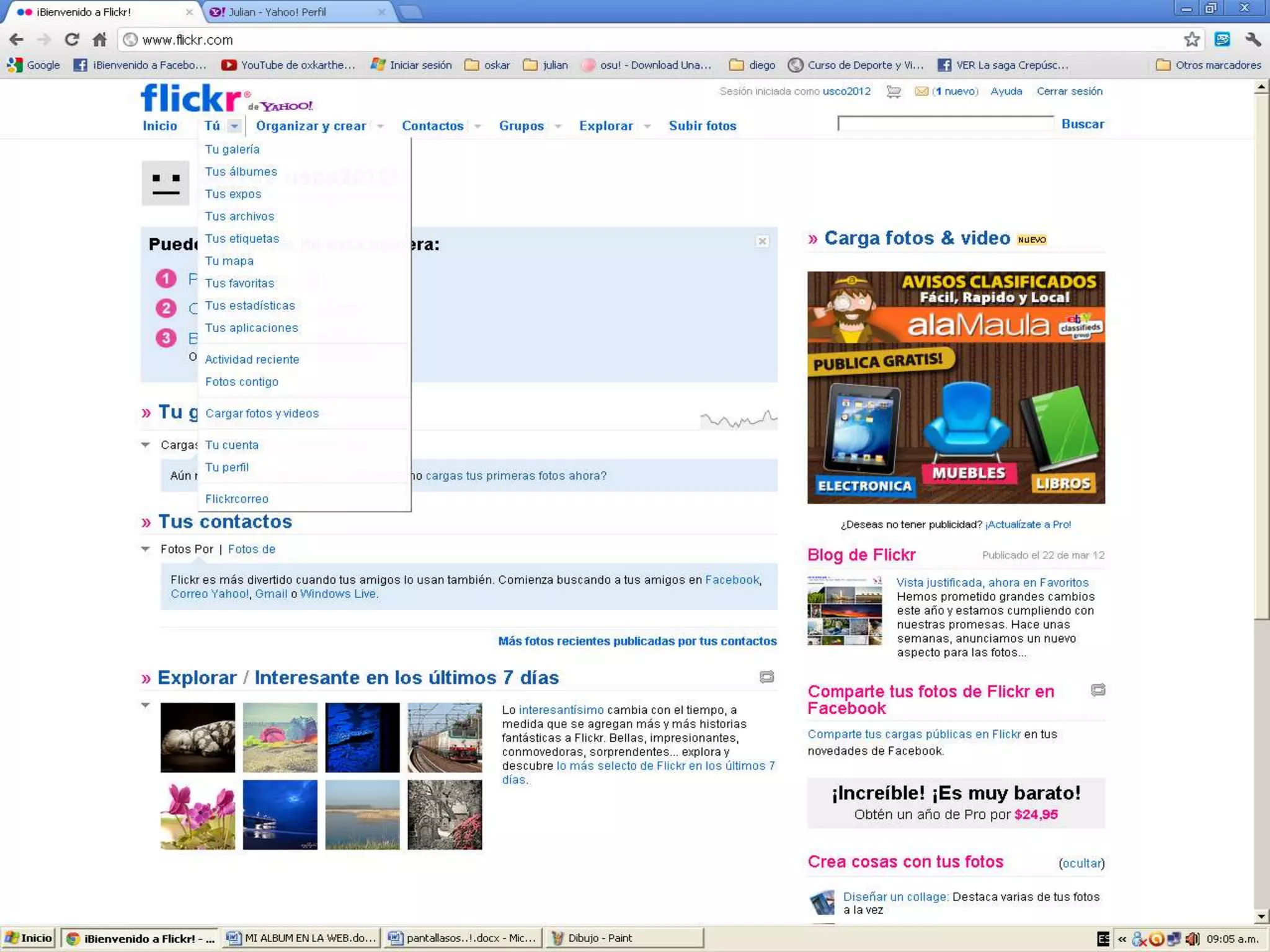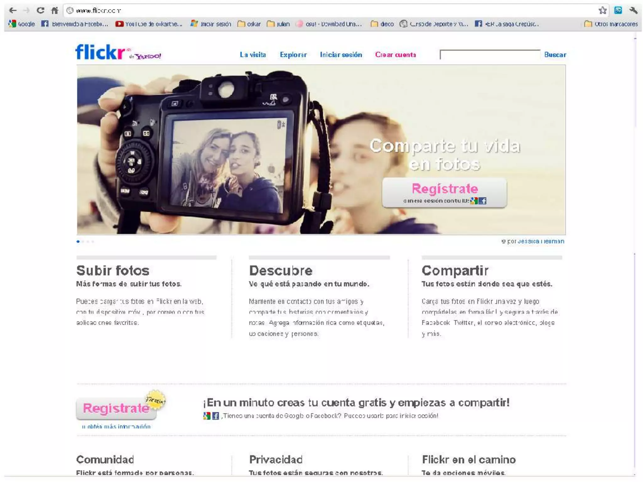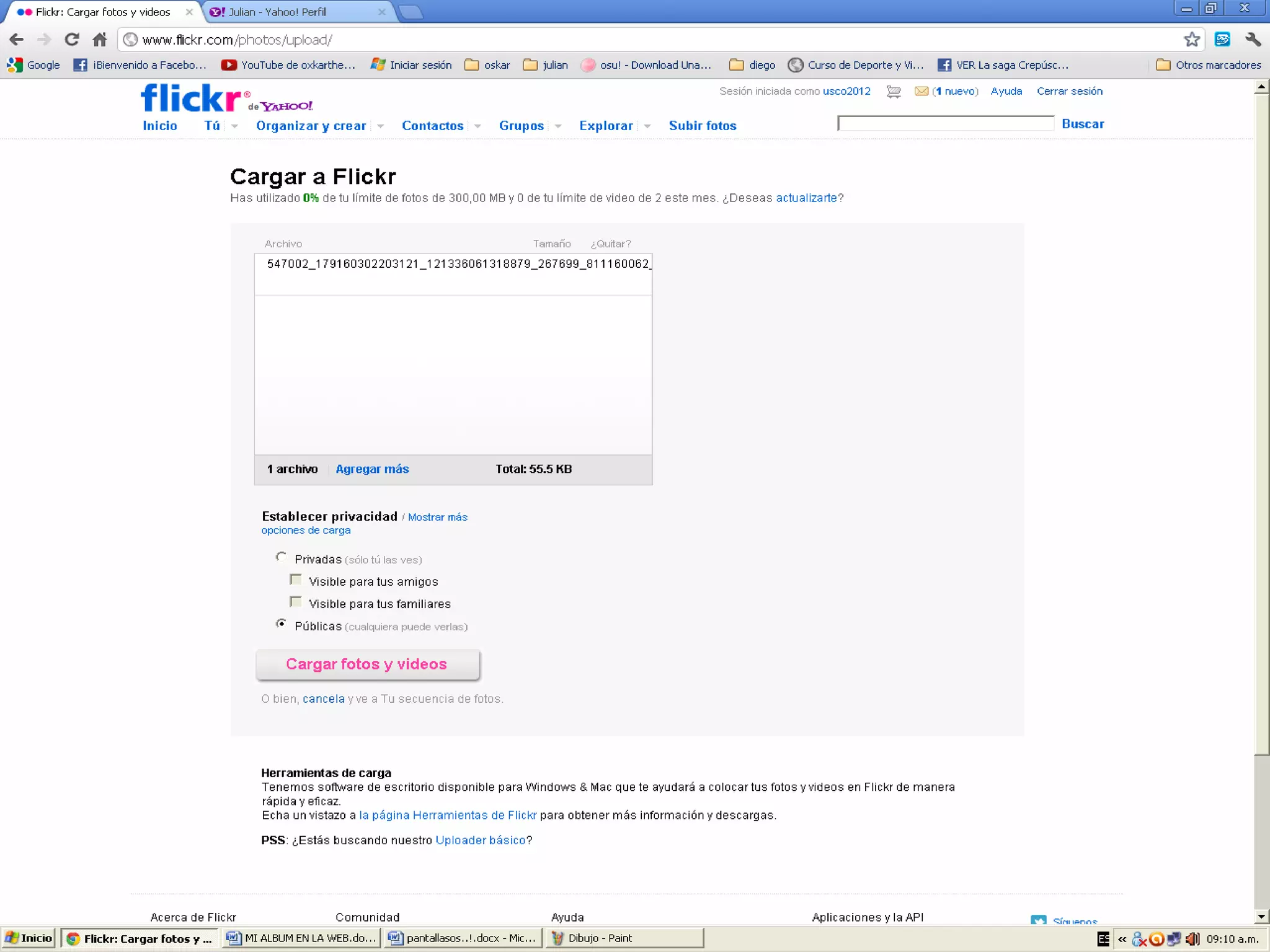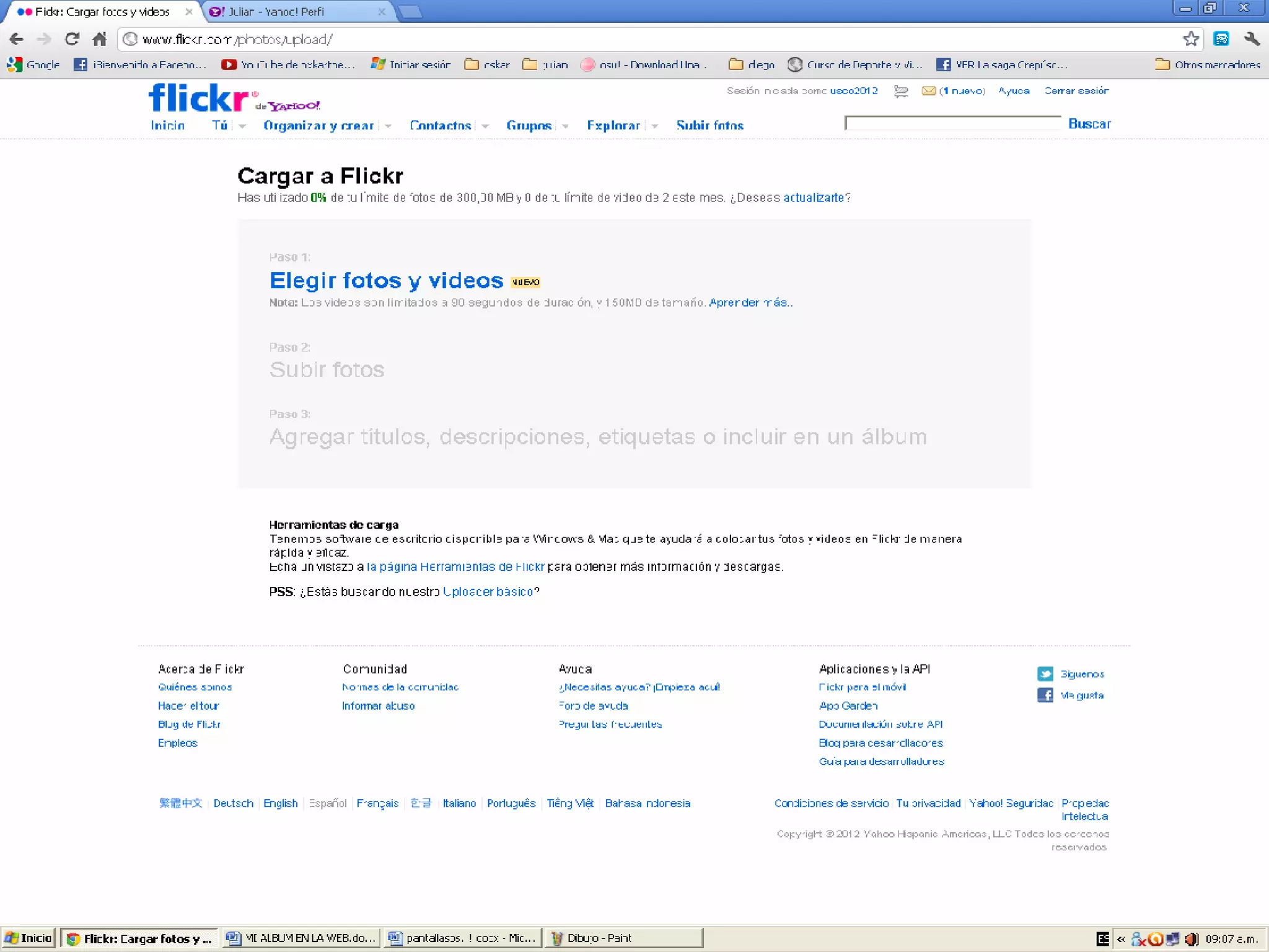 Este documento presenta los pasos para publicar fotos en la plataforma Flickr.com. Explica cómo ingresar a la cuenta de usuario, subir las fotos seleccionadas y agregarles títulos, etiquetas y descripciones. Finalmente, indica que las fotos ya están publicadas y accesibles a través de la dirección URL asociada a la cuenta del usuario en Flickr.