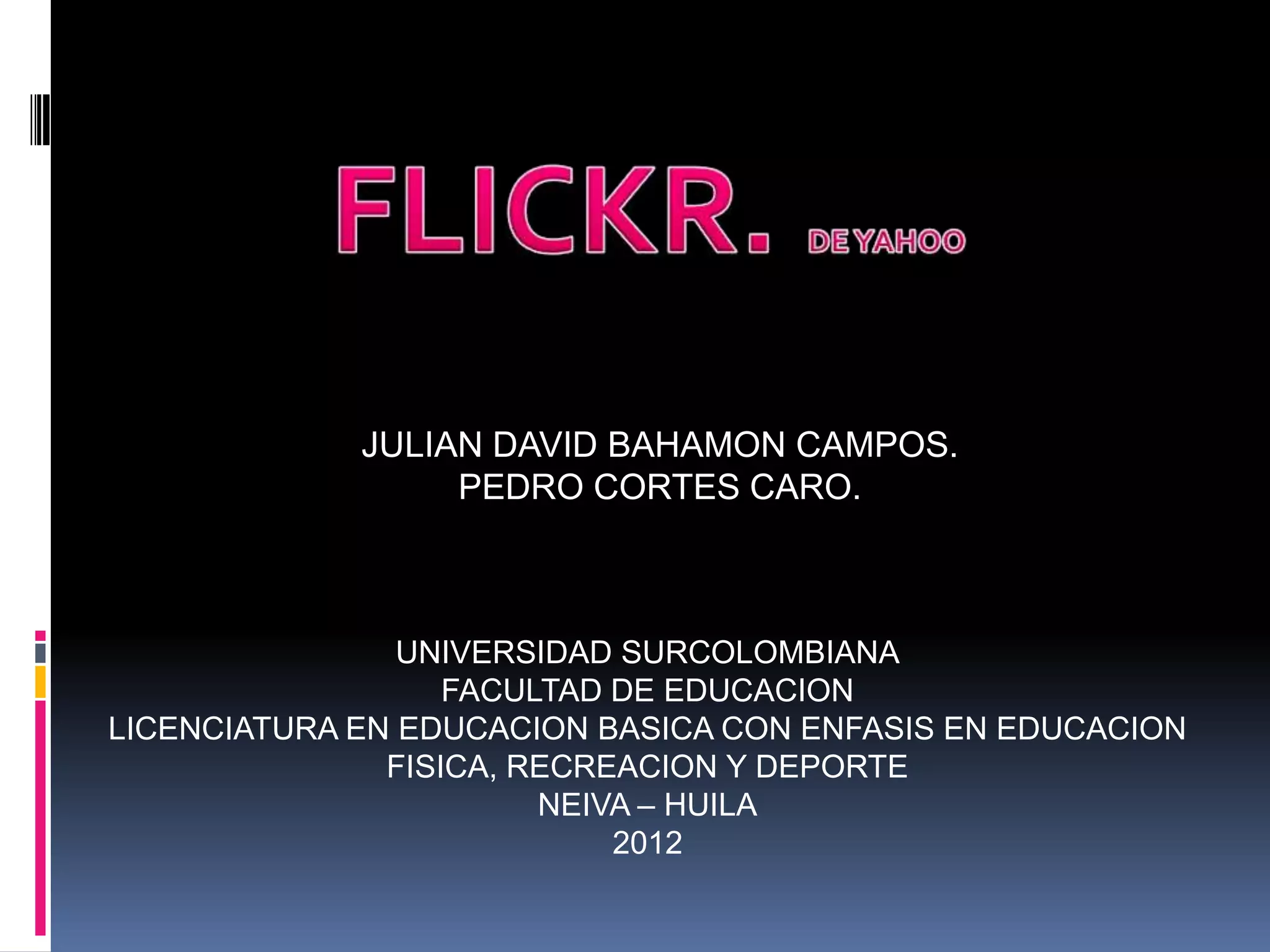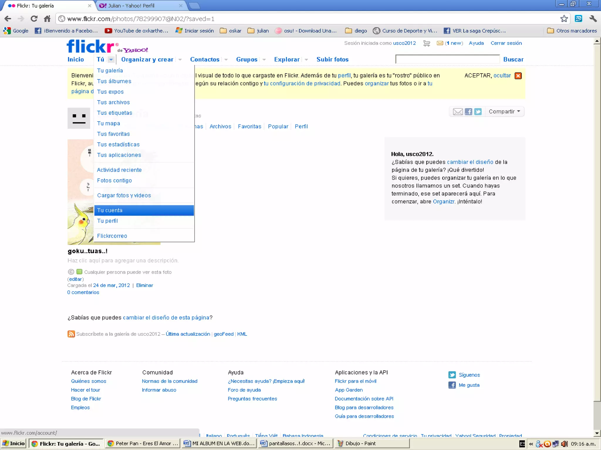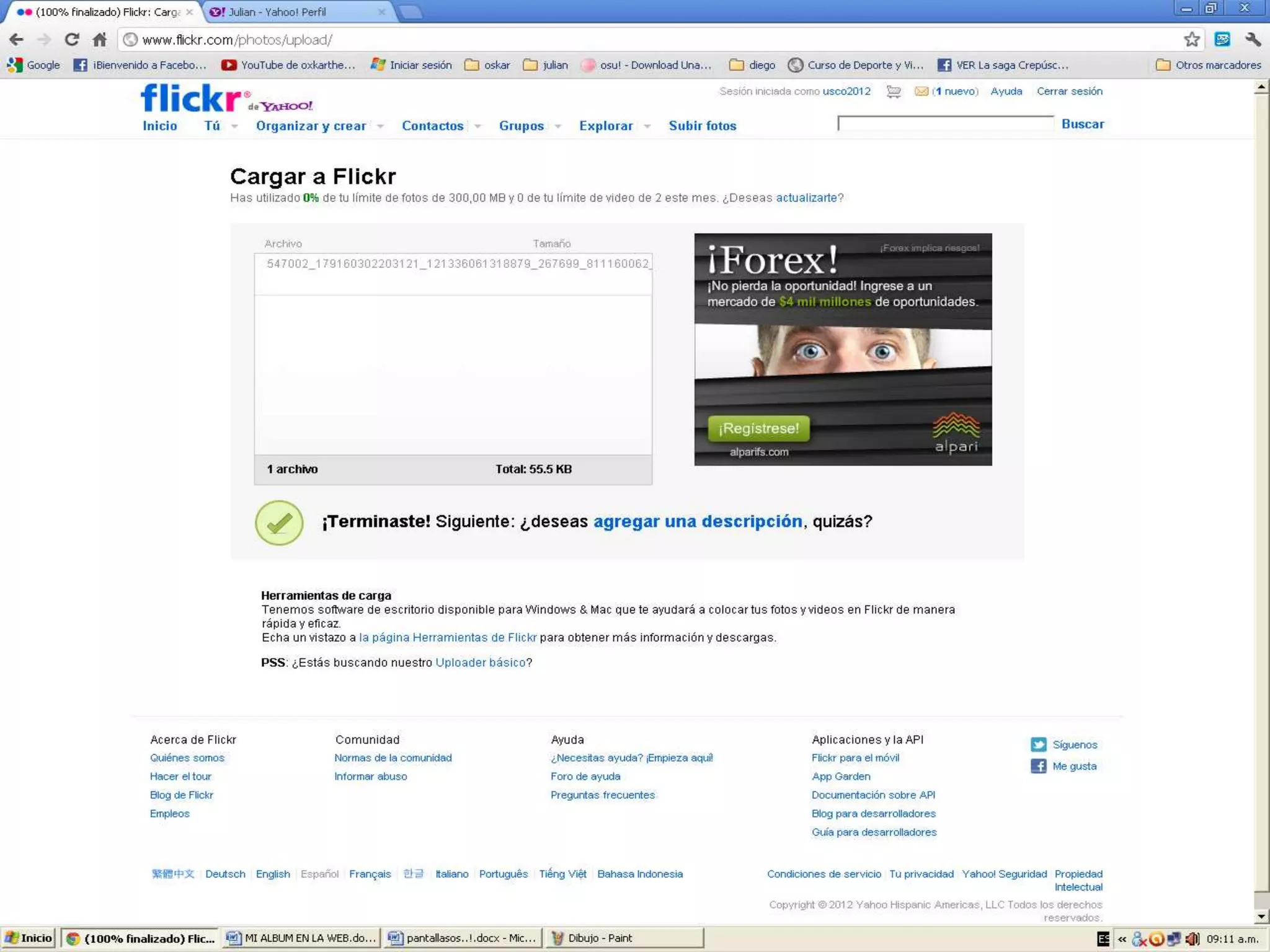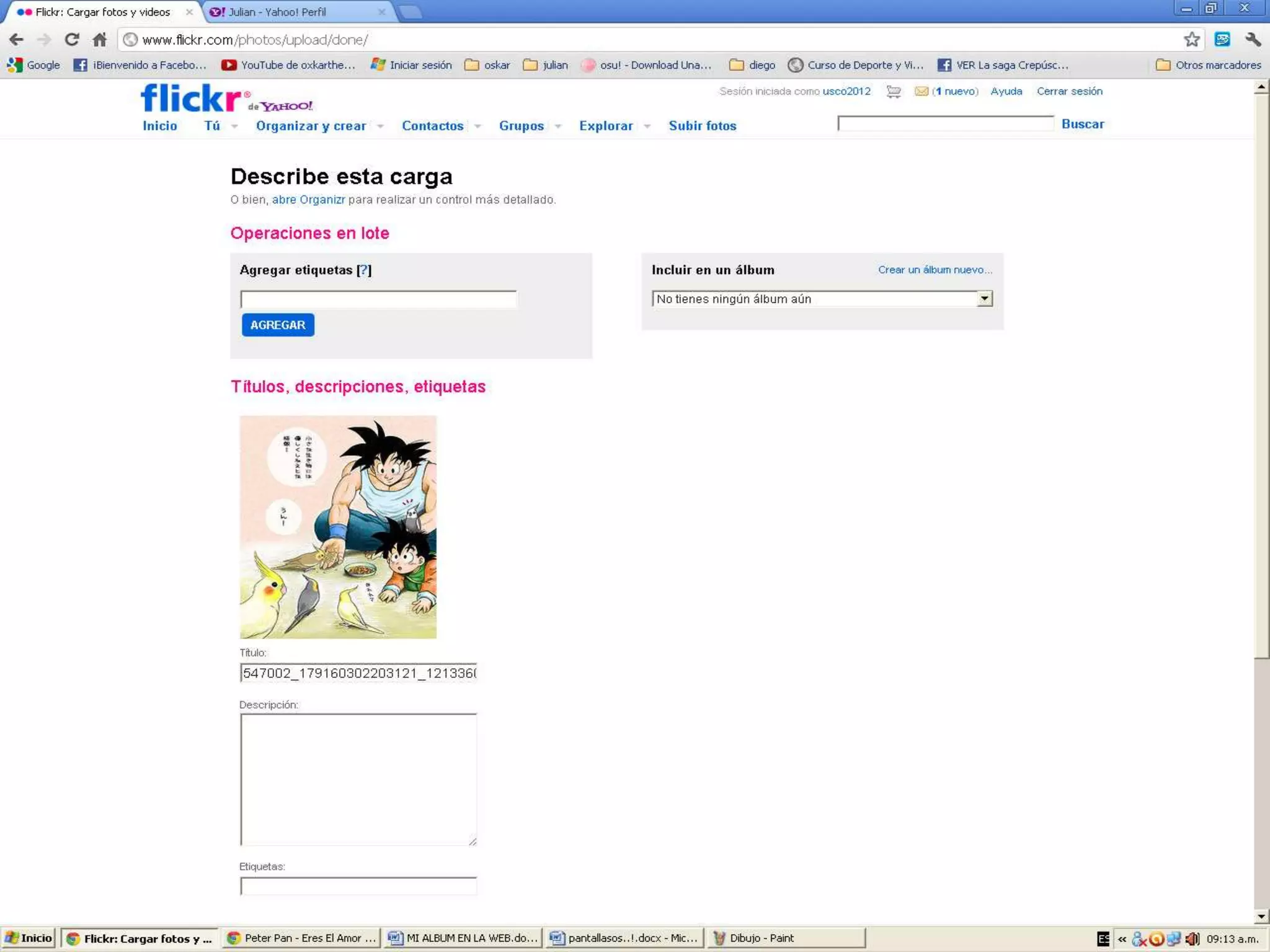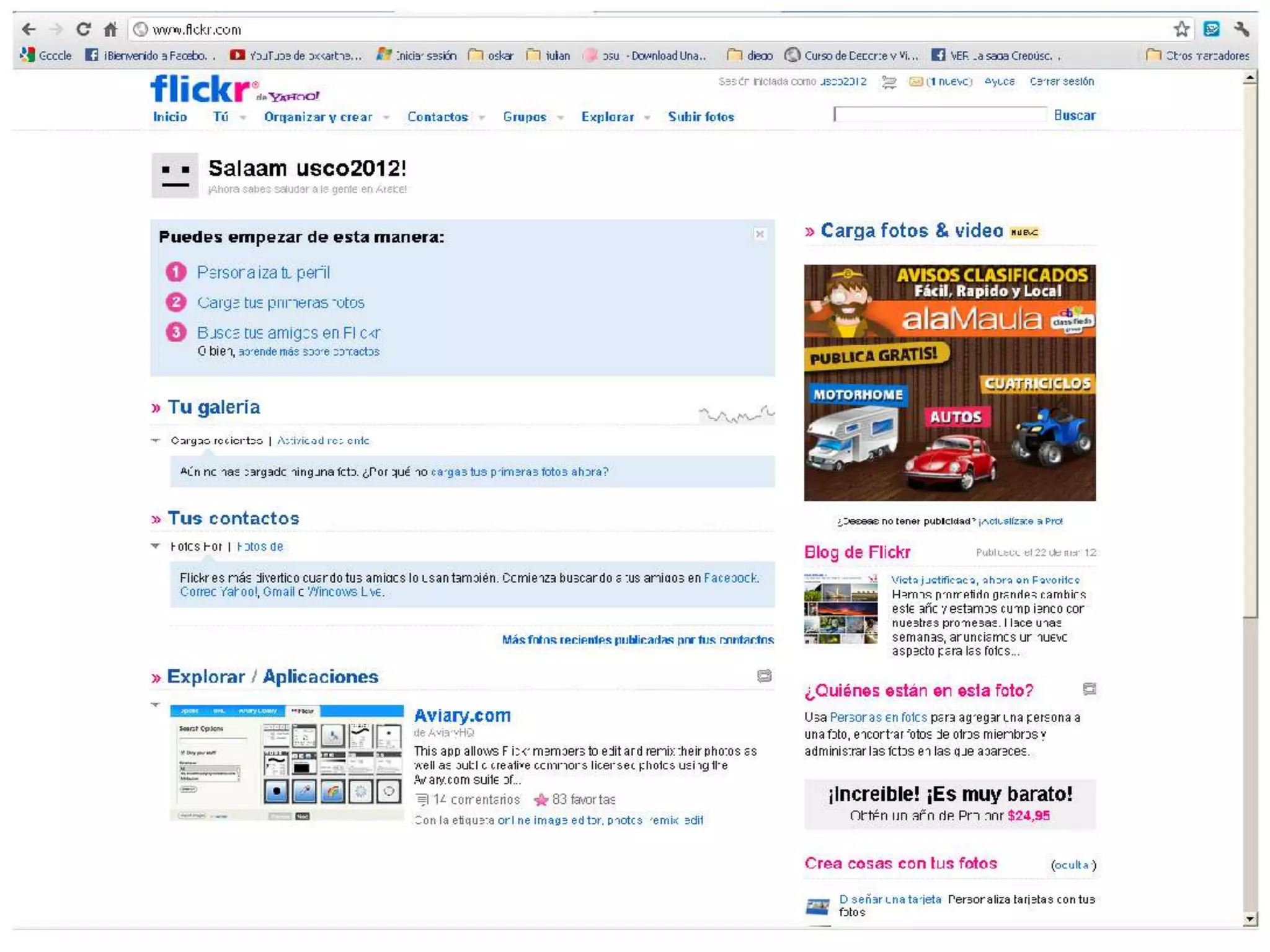 Este documento presenta los pasos para publicar fotos en la plataforma Flickr.com. Explica cómo ingresar a la cuenta de usuario, subir las fotos seleccionadas y agregarles títulos, etiquetas y descripciones. Finalmente, indica que las fotos ya están publicadas y accesibles a través de la dirección URL asociada a la cuenta del usuario en Flickr.