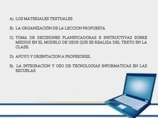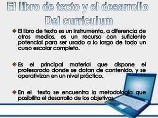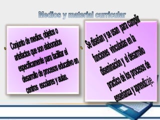 Los materiales curriculares son una estrategia clave para la difusión de innovaciones educativas. Adoptarán características diferentes dependiendo del modelo de curriculum bajo el cual se elaboran. A mediados del siglo XIX surgió la necesidad de materiales que permitieran facilitar y sistematizar la enseñanza. En el siglo XX, el libro de texto se convirtió en el instrumento básico para organizar el currículum a gran escala, la enseñanza y la escolarización.