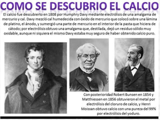 El calcio es el mineral más abundante en el cuerpo humano y es esencial para los huesos, dientes, músculos y procesos celulares. Se encuentra naturalmente en compuestos como la calcita y el yeso. Químicamente, es un metal alcalino terroso con un número atómico de 20. Es importante biológicamente para la estructura ósea, contracción muscular y activación enzimática. Los suplementos de calcio como el carbonato de calcio se usan para tratar deficiencias.