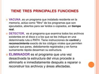 Un antivirus es un programa que previene y elimina virus informáticos. Tiene tres funciones principales: actuar como filtro de programas ejecutados, examinar archivos en busca de virus, y eliminar virus e infectados detectados. Proporciona protección contra amenazas comunes como archivos adjuntos maliciosos y sitios web fraudulentos.