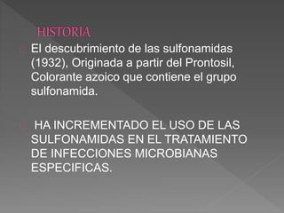 El documento describe el descubrimiento y uso de las sulfonamidas para tratar infecciones bacterianas. Inicialmente eran efectivas contra una amplia gama de bacterias, pero la aparición de resistencias ha limitado su utilidad. Actualmente se usan principalmente para tratar infecciones del tracto urinario e infecciones combinadas con trimetoprim.