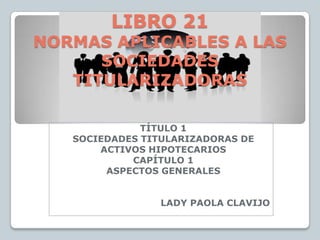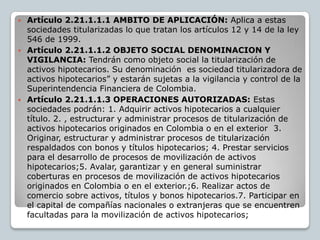 Este documento establece las normas aplicables a las sociedades titularizadoras de activos hipotecarios en Colombia. Define sus objetivos, operaciones autorizadas y requisitos como la separación patrimonial, manejo de riesgos, revelación de información y obligaciones. También especifica el capital mínimo requerido de $65.775.000.000, y los requisitos de patrimonio adecuado y relación de solvencia que deben mantener.