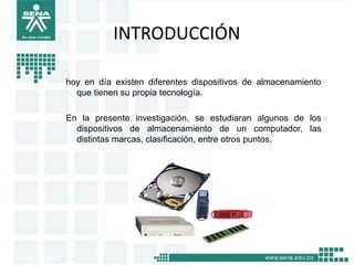 Este documento describe y compara diferentes dispositivos de almacenamiento como discos duros, unidades de CD/DVD, disquetes y sus características. Explica los protocolos de comunicación IDE y SATA y compara sus velocidades de transferencia. También describe las partes, tipos y fabricantes de las unidades ópticas y magnéticas mencionadas.