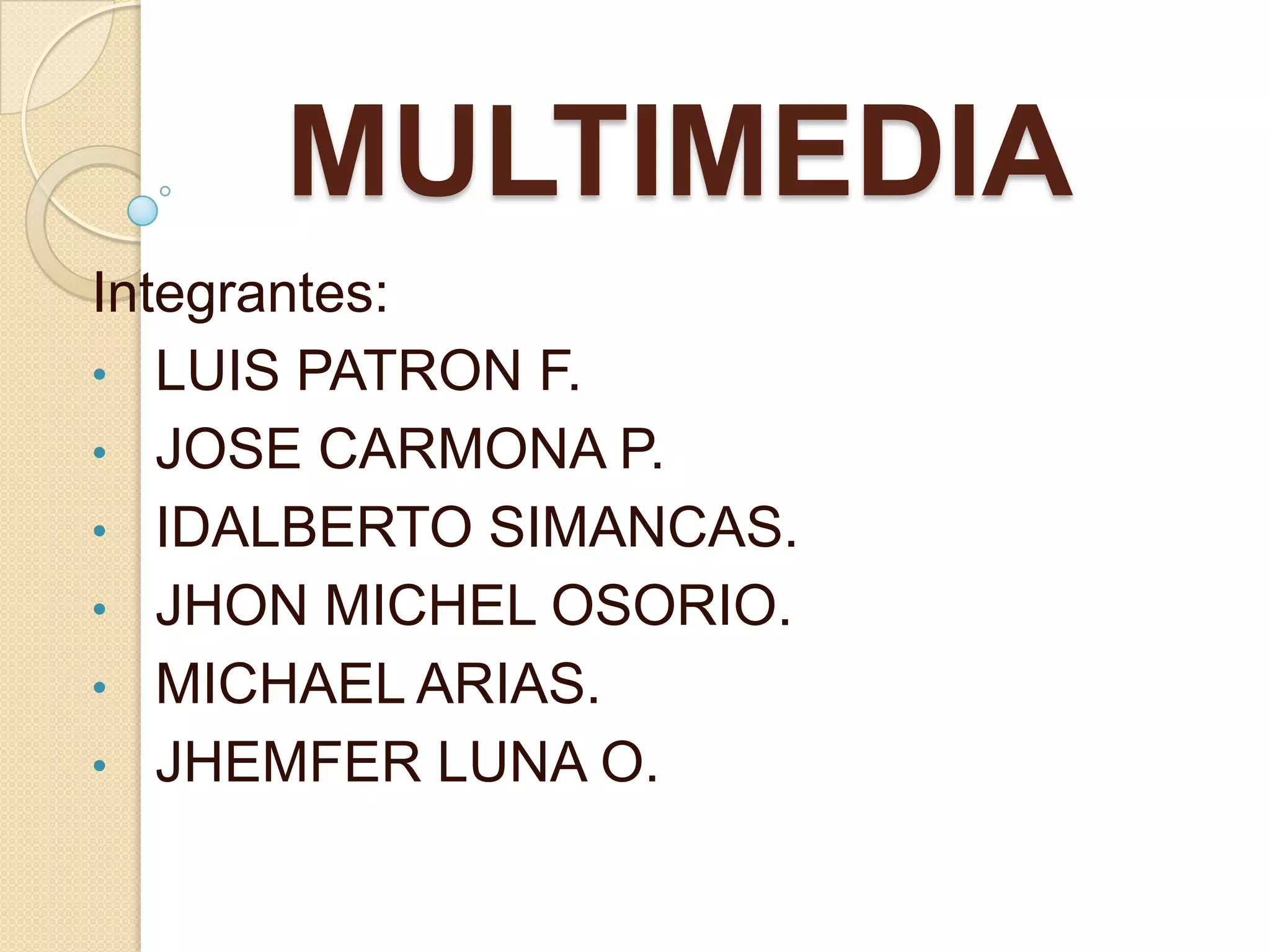 Este documento presenta una introducción general a la multimedia, incluyendo definiciones, herramientas de desarrollo, y aplicaciones. Explica que la multimedia involucra la combinación de texto, gráficos, sonido, animación y video que se entregan a través de computadoras u otros medios electrónicos. También describe cómo la multimedia se usa en negocios, escuelas, hogares y lugares públicos para presentaciones, capacitación, mercadeo y más.