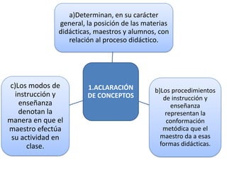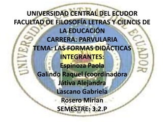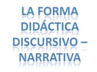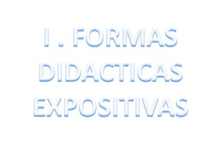 El documento describe diferentes formas didácticas como la exposición, la pregunta, el estímulo y la conversación instructiva. Explica que la exposición del maestro debe ser viva, natural y causar suspenso en los estudiantes sin falsear el contenido. También cubre el uso de preguntas y estímulos por parte del maestro para motivar a los estudiantes y fomentar su razonamiento y expresión verbal.
