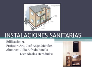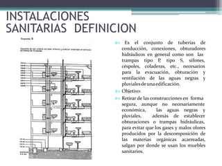 Este documento describe los componentes y clasificación de las instalaciones sanitarias. Explica que las instalaciones sanitarias incluyen tuberías, registros, sifones y otros elementos para evacuar aguas negras, grises y pluviales de manera segura. También clasifica los sistemas de drenaje en sanitario y pluvial, e instalaciones de primera, segunda y tercera clase dependiendo del uso. Finalmente, detalla materiales comunes como fierro fundido, PVC y concreto, así como componentes como bajadas de