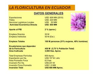 Este documento resume la industria florícola en Ecuador. La floricultura genera más de $850 millones en actividad económica directa y emplea a 100,000 personas. Ecuador es el tercer mayor exportador mundial de flores, exportando $608 millones en 2010. Sin embargo, la participación de mercado de Ecuador está disminuyendo frente a competidores como Kenia y Etiopía, que están ganando terreno rápidamente. Se necesitan medidas como acuerdos comerciales y líneas de crédito para apoyar a la industria florícola