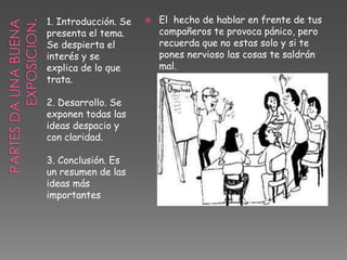 Este documento proporciona instrucciones para dar una buena exposición oral o escrita. Explica que una exposición debe tener una introducción, desarrollo y conclusión. Además, recomienda elegir un tema interesante, investigarlo a profundidad, organizar la información de manera lógica y usar materiales visuales para respaldar las ideas principales. La preparación y concentración son claves para una presentación exitosa.