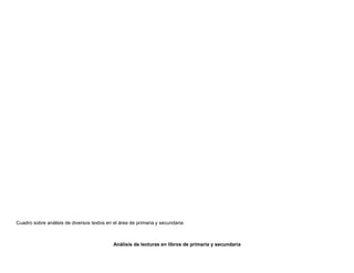 Este documento presenta un análisis de varias lecturas encontradas en libros de primaria y secundaria. Se analizan los valores, ideologías e implicaciones pedagógicas de cada lectura. Los textos abarcan temas de ciencias naturales, física y otros asuntos curriculares. El documento provee una descripción concisa pero completa de cada lectura y su contenido.