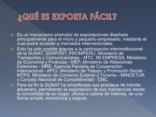 Exporta Fácil es un servicio peruano que permite a micro y pequeños empresarios exportar sus productos de forma sencilla, económica y segura desde cualquier parte del país. El servicio ofrece beneficios como exportar sin costo, participar en ferias internacionales, y recibir asesoría en exportaciones. Para usar Exporta Fácil, los empresarios deben contar con el RUC, llenar una declaración de exportación, e imprimir y presentar copias en oficinas de SERPOST junto con la mercancía.