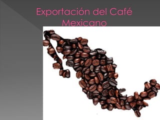 Este documento habla sobre el comercio internacional de café en México. Explica que 12 estados mexicanos producen café, con Chiapas, Veracruz, Puebla y Oaxaca concentrando la mayor cantidad. En la cosecha de 1999-2000, México produjo 6.2 millones de sacos de café de 60 kg cada uno, exportando 5.1 millones de sacos (83% de la producción) a 52 países.