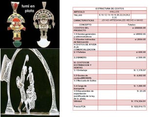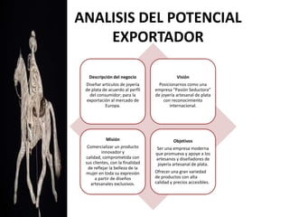 Este documento presenta un análisis del potencial de exportación de joyería artesanal de plata peruana a Europa. Describe el negocio de diseñar joyería de plata para el mercado europeo, con una visión de posicionarse como una marca reconocida internacionalmente. Incluye una matriz FODA, proyecciones financieras y detalles sobre distribución internacional y modalidades de pago.
