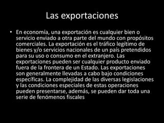 El documento describe las exportaciones, incluyendo que son bienes o servicios enviados a otros países con fines comerciales. Explica que existen diferentes estrategias para exportar como hacerlo a través de subsidiarias u otros intermediarios, y que hay tanto ventajas como desventajas para las empresas que exportan. También identifica errores comunes como falta de asesoría y descuidar mercados externos cuando el mercado interno está fuerte. Finalmente, divide el desarrollo de la exportación en tres etapas que van desde compromiso inicial hasta realizar exportaciones regulares.