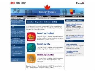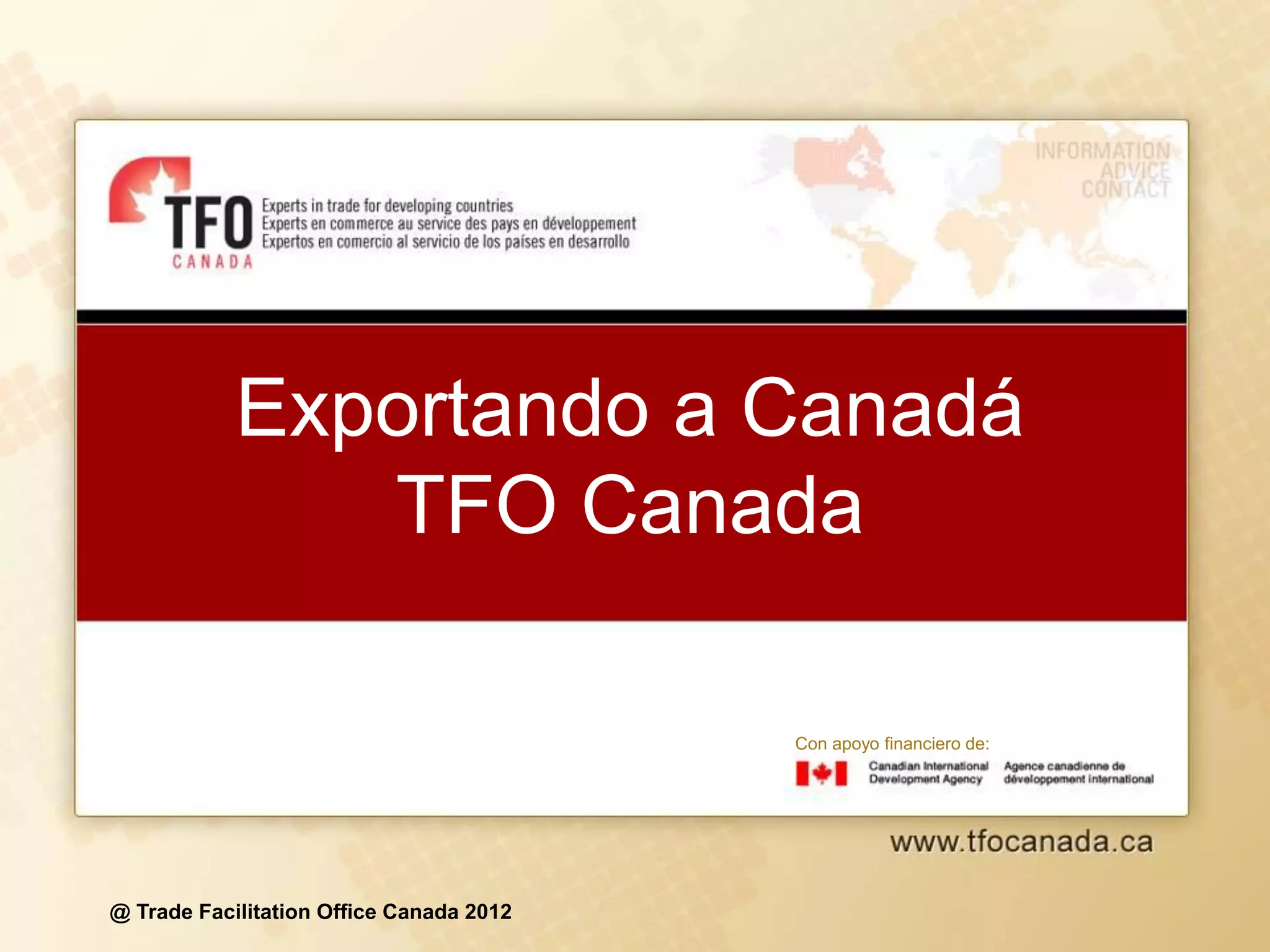 Este documento presenta información sobre el mercado canadiense y cómo acceder a él. Resume que Canadá tiene una población concentrada de 33.4 millones, con la mayoría viviendo en Ontario y Quebec. Explica que el consumidor canadiense es informado, consciente de los precios y la salud, y sensible a causas sociales. También proporciona datos demográficos e indicadores económicos clave sobre Canadá.