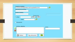 El documento explica los pasos para exportar un libro creado en Moodle a formato HTML. Estos pasos incluyen hacer clic en el botón Exportar, crear una carpeta destino llamada WEB, seleccionar HTML como formato de exportación y la opción de empaquetar, y finalmente hacer clic en Publicar para generar los archivos HTML del libro en la carpeta destino.