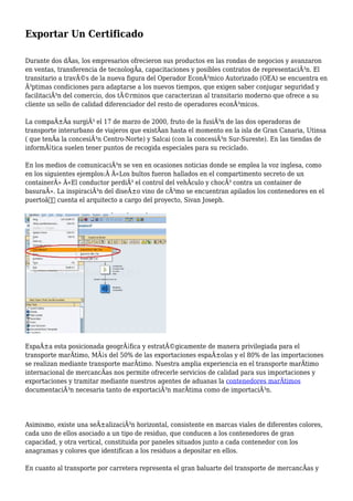El documento destaca la importancia del transporte marítimo en España, donde más del 50% de las exportaciones y el 80% de las importaciones se realizan por esta vía. También menciona la evolución de los transitarios hacia nuevos modelos que integran seguridad y facilitación del comercio, así como la fusión de empresas de transporte en Gran Canaria. Además, se aborda la relevancia del reciclaje y la correcta señalización de residuos en la gestión ambiental.
