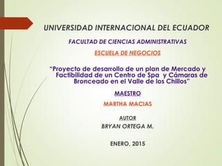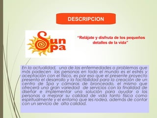 Este documento presenta un proyecto para crear un centro de spa y cámaras de bronceado en el Valle de los Chillos. Incluye un análisis FODA, una investigación de mercado con encuestas a 350 personas, y define el segmento objetivo como personas de ingresos medios-altos entre 21-65 años. También describe los servicios que ofrecerá el centro y estrategias de marketing como precios competitivos, membresías y promociones. Las conclusiones son que el mercado tiene demanda para este tipo de servicio exclusivo y las re