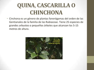 Este documento describe la quina o cinchona, un género de plantas de la familia Rubiaceae. Crecen en los Andes de Sudamérica y su corteza contiene alcaloides como la quinina, usada para tratar la malaria. Relata la historia de cómo la Condesa de Chinchón fue curada de la fiebre usando la corteza, y cómo los jesuitas luego la distribuyeron. Describe las características, especies y usos medicinales de la quina para tratar fiebres, anemia y malaria.