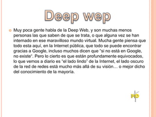 El documento habla sobre la Deep Web y las medidas de seguridad para navegar en ella. La Deep Web es la parte de Internet no indexada por los motores de búsqueda y representa el 96% del contenido total de Internet. Contiene tanto información legal como ilegal oculta en sitios .onion accesibles solo a través de navegadores especiales y redes como Tor para mantener el anonimato. Se recomienda tomar precauciones como usar una PC y red separadas, encriptar la IP y tener actualizados antivirus y firewall antes de explorar la Deep Web.
