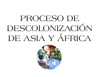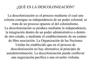 El documento describe el proceso de descolonización de Asia y África después de la Segunda Guerra Mundial. Explica que la descolonización implica que una colonia gana su independencia de un poder colonial, ya sea a través de la independencia, la integración o un estatus de libre asociación. Luego detalla algunos ejemplos clave de países que lograron su independencia, como Ghana, Kenia y varios países africanos, así como India, Filipinas e Indonesia en Asia. Finalmente, señala algunos de los desafíos iniciales que enf