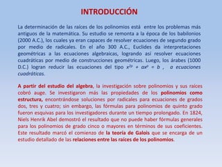 El documento trata sobre las raíces de polinomios. Brevemente discute que el estudio de las raíces de polinomios se remonta a los babilonios y que Euclides y los árabes lograron resolver ecuaciones cuadráticas y de segundo grado. Más adelante, se investigaron las propiedades de los polinomios y se encontraron soluciones para ecuaciones de grados dos, tres y cuatro, aunque las de quinto grado resultaron esquivas durante mucho tiempo.
