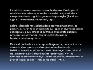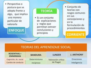 Este documento presenta un resumen de varias teorías del aprendizaje social. Explica que estas teorías forman una corriente crítica frente al conductismo de Skinner y se oponen a la idea de que el aprendizaje es solo una respuesta a estímulos. También describe los aportes de autores clave como Bandura, Zimmerman y Lunzer y analiza conceptos como la cognición, los procesos cognitivos y su relación con la conducta. Finalmente, resume cuatro posiciones teóricas sobre las explicaciones de los procesos cognit