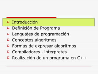 El documento introduce el lenguaje de programación C++. Explica que C++ es un lenguaje de alto nivel que soporta programación orientada a objetos y estructurada. Describe los conceptos básicos de algoritmos, programas, lenguajes de programación, compiladores e intérpretes. Resume los pasos para crear un programa simple en C++.