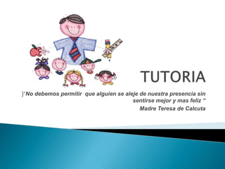 Este documento describe los aspectos clave de la tutoría escolar. La tutoría provee orientación a estudiantes para apoyar su autoconocimiento, desarrollo personal y bienestar emocional. Cada estudiante necesita un tutor adulto que lo conozca y en quien pueda confiar. La tutoría incluye observación del estudiante, escucha activa, entrevistas y el uso de técnicas como análisis de casos y juegos de roles. La carpeta del tutor contiene información sobre cada estudiante como entrevistas con padres, in