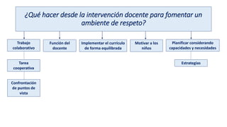 Este documento describe estrategias para fomentar un ambiente de respeto en el aula. Primero, los docentes deben implementar un currículo equilibrado y planificar considerando las capacidades individuales. También pueden organizar tareas cooperativas y confrontar puntos de vista de forma respetuosa. Segundo, los valores como el respeto y la tolerancia se deben enseñar con el ejemplo de los maestros y a través de actividades de resolución de conflictos sin violencia. Finalmente, involucrar a las familias y proponer problemas de la comunidad educ