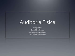 El documento describe los aspectos clave de la seguridad física y la auditoría física. Explica las áreas de seguridad física como los centros de procesamiento de datos, equipos, comunicaciones y seguridad del personal. También cubre las técnicas de auditoría como observación, revisión analítica e entrevistas, así como las responsabilidades de los auditores internos y externos.