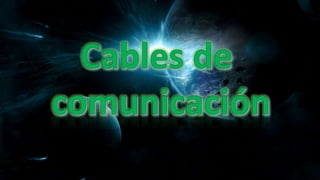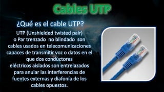 El documento describe diferentes tipos de cables utilizados en telecomunicaciones, incluyendo cable UTP (par trenzado no blindado), FTP (par trenzado frustrado a pantalla global), STP (par trenzado con blindaje), coaxial y fibra óptica. Cada cable se caracteriza por su capacidad de transmisión, protección contra interferencias, longitud máxima y aplicaciones típicas.