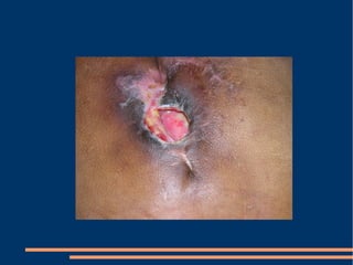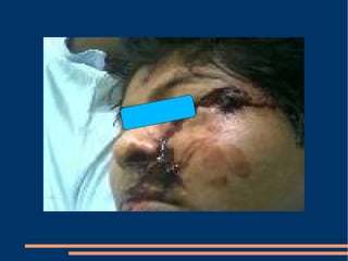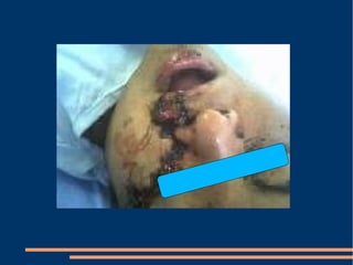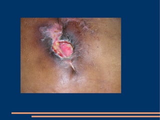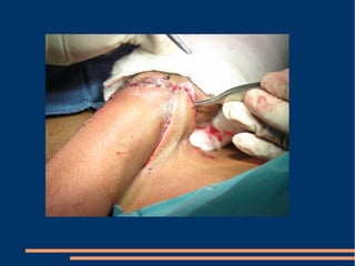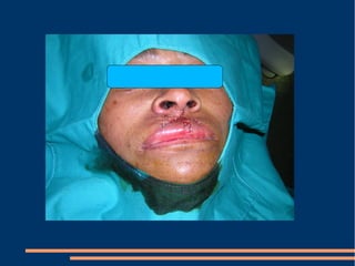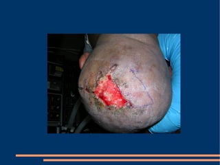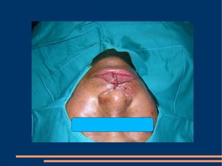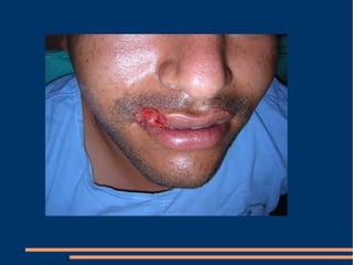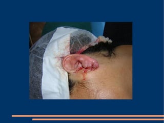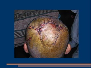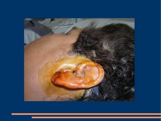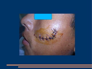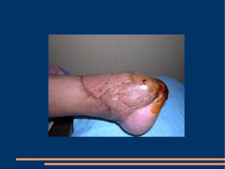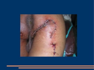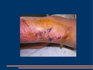 Este documento describe las diferentes fases de la cicatrización de heridas y factores que la influyen, así como técnicas para suturar defectos de piel. También clasifica los colgajos según su vascularización, composición de tejido transferido y transposición. Explica los sistemas vasculares cutáneos y tipos de colgajos cutáneos, fasciales y musculares más comunes con ejemplos de su uso en traumatismos y úlceras.