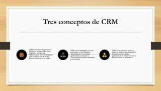 El documento proporciona información sobre qué es CRM (Customer Relationship Management o gestión de relaciones con clientes). Explica que el CRM es una estrategia que utilizan las empresas para gestionar sus interacciones con los clientes con el fin de mejorar la rentabilidad. También describe que los sistemas CRM son herramientas que permiten gestionar contactos, ventas y productividad para mejorar la experiencia del cliente. Finalmente, resume algunas de las ventajas clave de la implementación de un sistema CRM como la segmentación de clientes, optimización de ventas