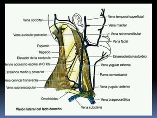 Este documento describe la irrigación venosa y el drenaje linfático de la cara y el cuero cabelludo, así como la anatomía de la glándula parótida. La linfa de diferentes regiones de la cara y el cuero cabelludo drena en ganglios linfáticos parotídeos, submandibulares y submentonianos. La glándula parótida está cubierta por una cápsula fascial densa y tiene forma irregular debido al espacio que ocupa entre la rama de la mandíbula y la apófisis masto