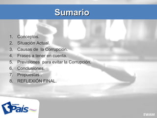 El documento aborda la corrupción como una principal amenaza al desarrollo, seguridad y calidad de vida, destacando su enraizamiento en la administración pública y la desconfianza de la población hacia las instituciones. Se identifican causas políticas, sociales y económicas que alimentan este problema, proponiendo medidas preventivas y un sistema de control más riguroso para combatirla. Finalmente, se enfatiza la necesidad de un esfuerzo colectivo y coordinado para erradicar la corrupción y restaurar la confianza pública.