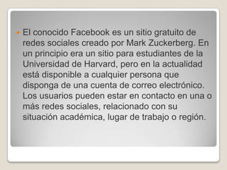 Facebook comenzó como una red social para estudiantes de Harvard pero se expandió rápidamente. Actualmente tiene más de 300 millones de usuarios a nivel mundial que pueden conectarse con amigos y familiares, compartir fotos y videos, y unirse a grupos. Aunque Facebook ha crecido exponencialmente, también ha recibido críticas sobre su manejo de la privacidad de los datos e información de los usuarios.