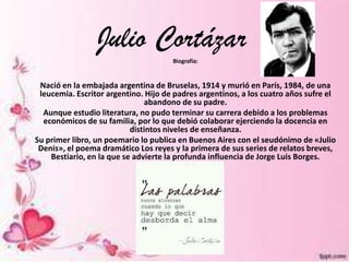 Julio Cortázar nació en Bruselas en 1914 y murió en París en 1984. Fue un escritor argentino conocido por sus cuentos experimentales y su novela Rayuela. Debido a problemas económicos, no pudo terminar sus estudios de literatura y tuvo que trabajar como profesor. Publicó varias obras que recibieron influencia de Jorge Luis Borges. Algunos de sus cuentos más destacados exploran temas como el tiempo, la muerte y la dependencia a objetos cotidianos.
