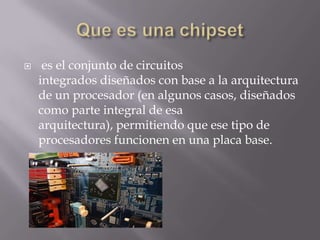 El documento habla sobre los componentes principales de un chipset de una placa base. Explica que el chipset está compuesto de circuitos integrados diseñados para hacer funcionar un tipo de procesador en una placa base. Luego describe que el northbridge es el circuito integrado más importante del chipset, encargado de la comunicación con el procesador, mientras que el southbridge se encarga de coordinar los dispositivos de entrada/salida y otras funciones de baja velocidad, comunicándose de forma indirecta con el procesador a través del northbridge.