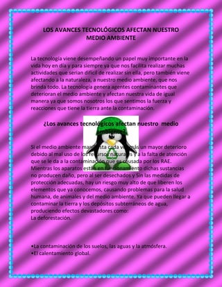 El documento discute cómo los avances tecnológicos afectan nuestro medio ambiente a través de la contaminación. La tecnología genera agentes contaminantes que deterioran el medio ambiente y afectan nuestra vida. Los desechos electrónicos y la falta de medidas de protección al desecharlos liberan elementos contaminantes que dañan la salud humana, de animales y el medio ambiente a través de la contaminación del suelo, agua y aire, el calentamiento global y la reducción de la capa de ozono, entre otros impactos.