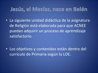 Este documento presenta la historia del nacimiento de Jesús según la tradición cristiana. Explica que Jesús nació en Belén el 24 de diciembre y que su nacimiento se celebra en Navidad. Describe que María y José viajaron a Belén donde Jesús nació en un pesebre porque no encontraron posada, y que pastores y los tres Reyes Magos, Melchor, Gaspar y Baltasar, fueron avisados e ir a adorar al recién nacido Jesús.