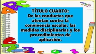 El documento establece normas sobre conductas que atentan contra la convivencia escolar y las medidas disciplinarias aplicables en la Escuela Normal Experimental de El Fuerte. Se busca fomentar una convivencia armónica mediante procedimientos claros, garantizando derechos como la presunción de inocencia y el derecho de apelación. Las medidas disciplinarias están enfocadas en educar y corregir actitudes en lugar de castigar, promoviendo el diálogo y el respeto entre la comunidad escolar.