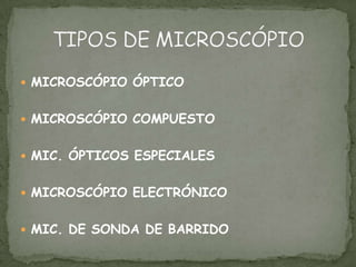 El documento describe diferentes tipos de microscopios que se pueden usar para obtener imágenes aumentadas de objetos minúsculos, incluyendo el microscopio óptico, el microscopio compuesto, microscopios ópticos especializados, el microscopio electrónico y el microscopio de sonda de barrido. Cada uno funciona de manera diferente para lograr aumentos mayores y mejores imágenes.