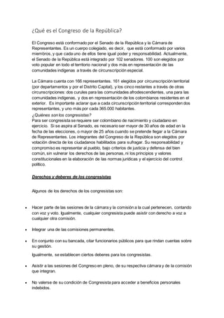 El documento describe las funciones y estructura del Congreso de Colombia. Explica que el Congreso está compuesto por el Senado y la Cámara de Representantes, y tiene funciones como la de reformar la constitución, crear leyes, ejercer control político sobre el ejecutivo, y juzgar a altos funcionarios. También describe los requisitos para ser congresista, sus derechos y deberes, y las diferentes comisiones en las que trabajan.