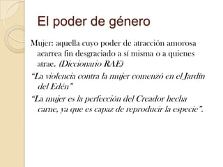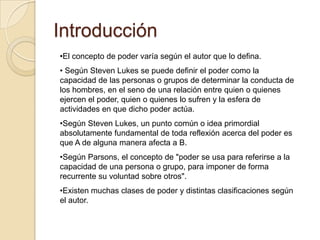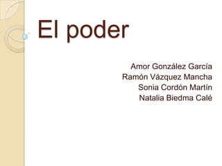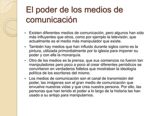 El documento analiza diferentes tipos de poder como el poder político, el poder de la iglesia, el poder de género y el poder de los medios de comunicación. Explica que el poder político residía en la monarquía, nobleza y burguesía y que cada clase social se apoyaba y mantenía su poder mediante representaciones e imágenes. También describe que la iglesia ha ejercido un poder hegemónico sobre la sociedad controlando las conciencias a través de doctrinas, normas y sacramentos. Finalmente, señala que los medios